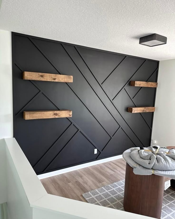 Eine mattschwarze Akzentwand mit geometrischem Muster aus dezenten Zierleisten, die für Tiefe und Struktur sorgt. Die Kombination aus klaren Linien und dem Kontrast von Schwarz und natürlichem Holz macht sie modern und zugleich zeitlos. Die schwebenden Regalbretter aus massivem Holz setzen warme Akzente und bieten Platz für Deko, Pflanzen oder Bücher – ideal, um die Wand sowohl funktional als auch dekorativ zu nutzen.